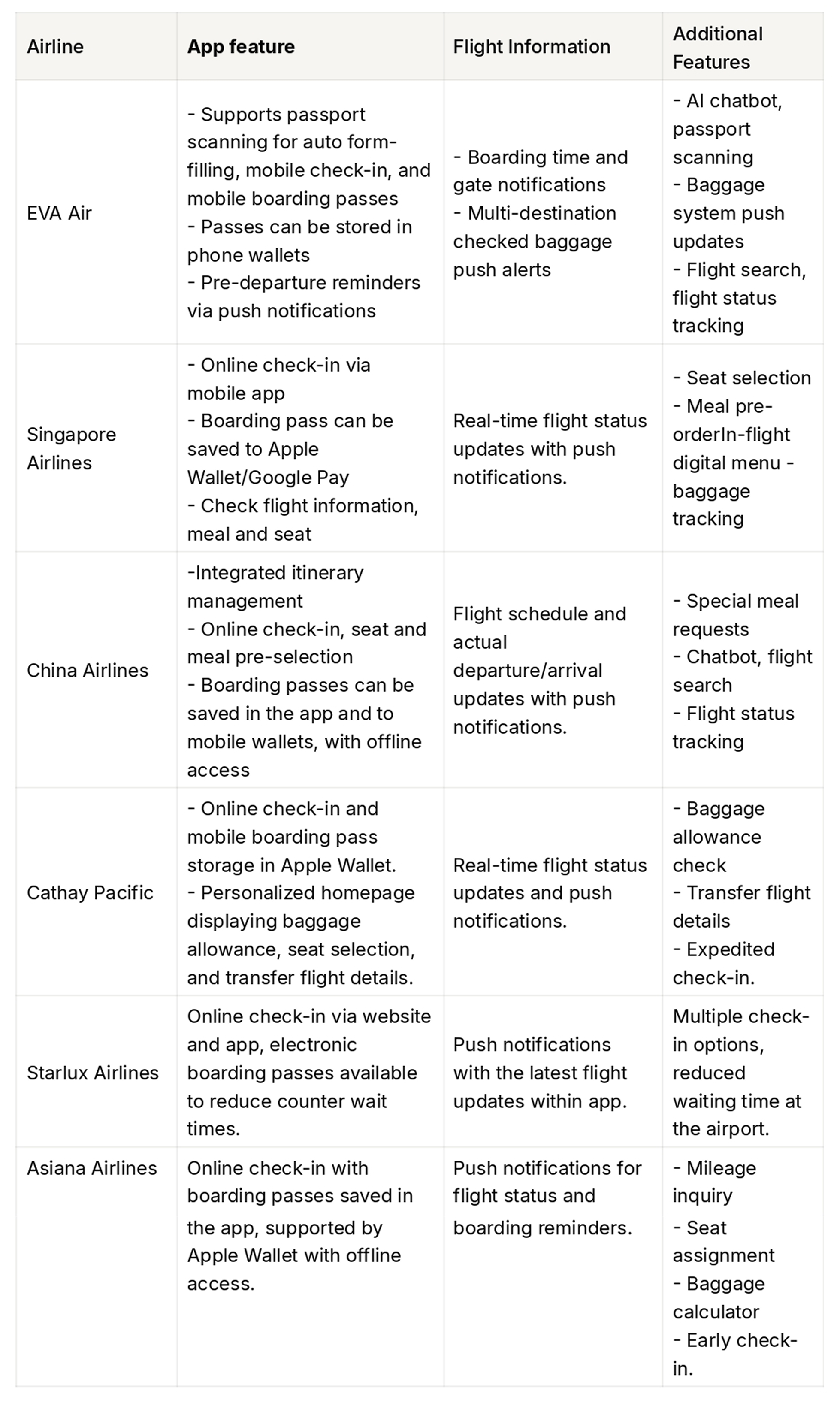 Following is a comparison of mobile app of several well-known airlines in Taiwan and Asia.